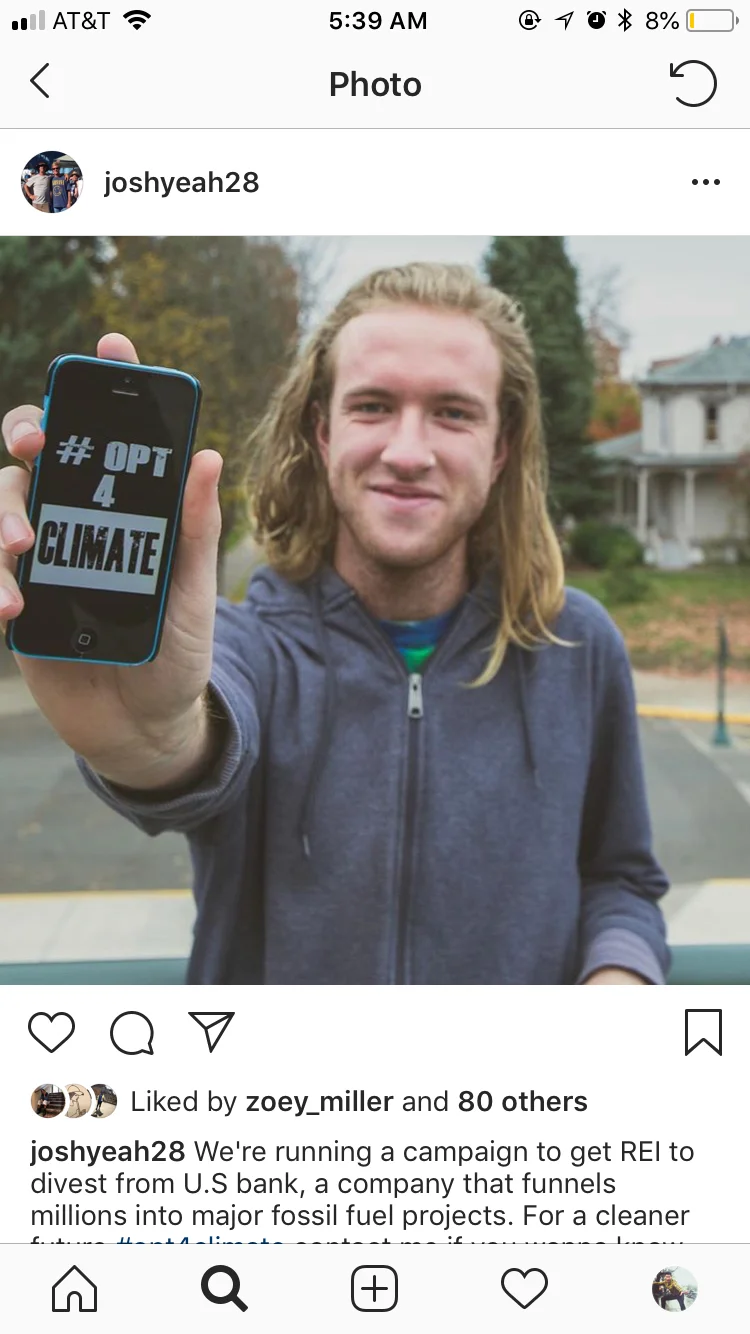 Opt 4 Climate says, “Banking is stewardship, too. REI's banking practices fly in the face of its claim to put environmental purpose above profit and prevent REI from reaching its goal to become carbon-neutral by 2020.”The organization has targeted REI due to claims like, “our co-op’s health depends on the environment’s health.” REI certainly promotes itself as a very eco-friendly brand, and while the staff at Opt 4 Climate are sure to point out the brands consumerism base, though note that is is indeed important for people to get get outside, and this in turn, promotes a greater respect for the environment in which we all live, breathe, and play. This sort of adventure based advertising has lead to campaigns like REI’s #OPTOUTSIDE which has since taken off to become an instagram favorite among avid hikers, cyclists, kayakers, and general go getters. And this is where Opt 4 Climate got their name, encouraging people to think about their impact with the #OPT4CLIMATE and they have encouraged their supporters to post photos with their cell phones or the linked image to show.their support for REI to divest their money into banks that are better for the environment.