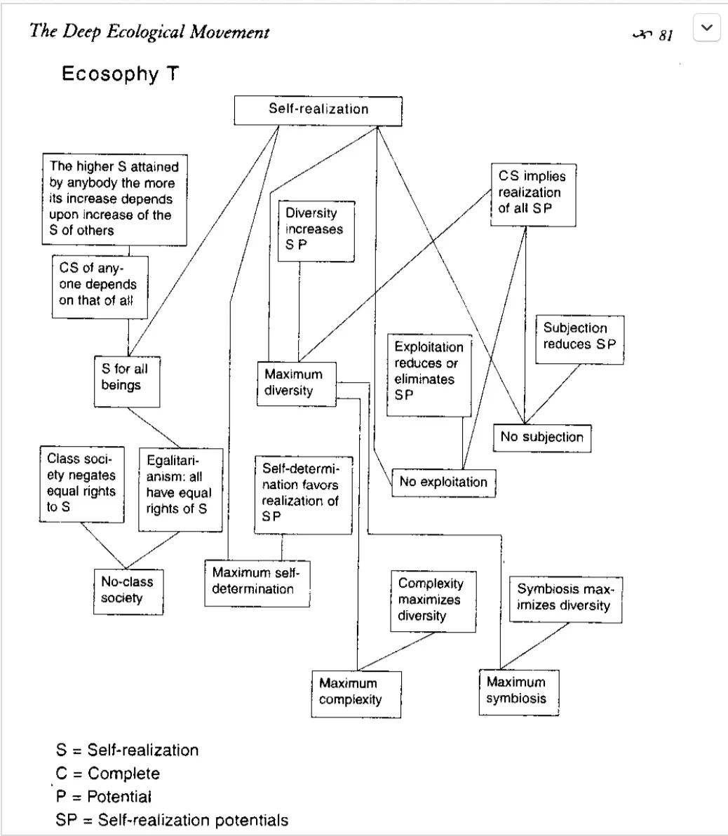 He then has another diagram which Explains the concept of Ecosopies which are not religions in the traditional sense, they are more of philosophical modes of questioning rooted in ecology, which a person holds constant. Ness calls his form of ecosophy “ Ecosophy T” - and as he gives another diagram based on self realization with the aim to know where one stands in the course of their life in trying to achieve maximum complexity, maximum symbiosis, zero exploitation, no subjection, egalitarianism, and the fact that we all need to rise together to continue the process of self realization, as it fundamentally cannot be done alone.